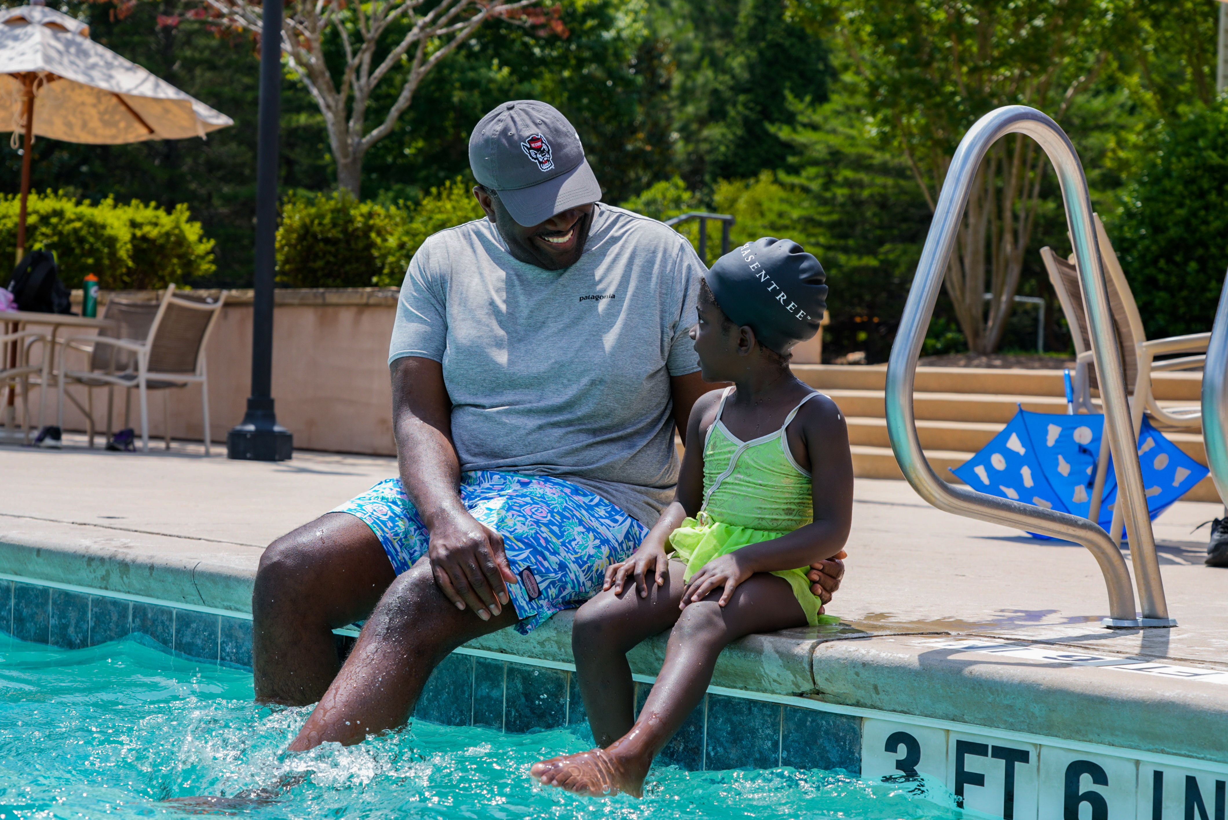 At Hasentree, we have three pools, including a six-lane, 25-yard competition pool and a zero-entry children's splash pool with interactive features, as well as the "Hasenator," a 90-foot, double-loop water slide for kids of all ages. In addition, all swimmers 18 and younger can join our swim team, the Hasentree Hammerheads, to participate in the Tarheel Swimming Association, North Carolina's largest summer recreation youth swim league.